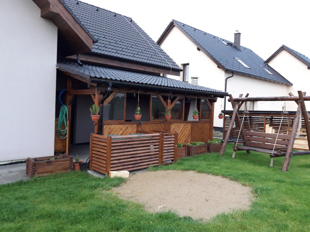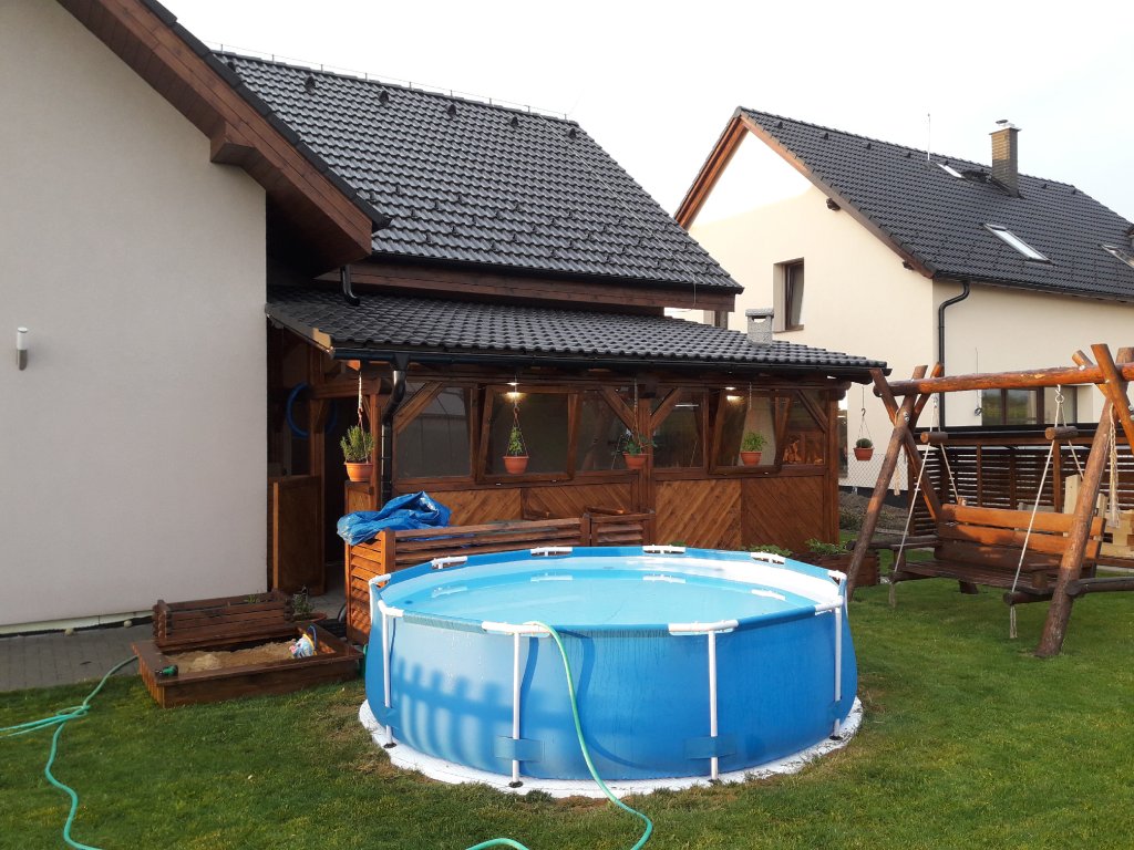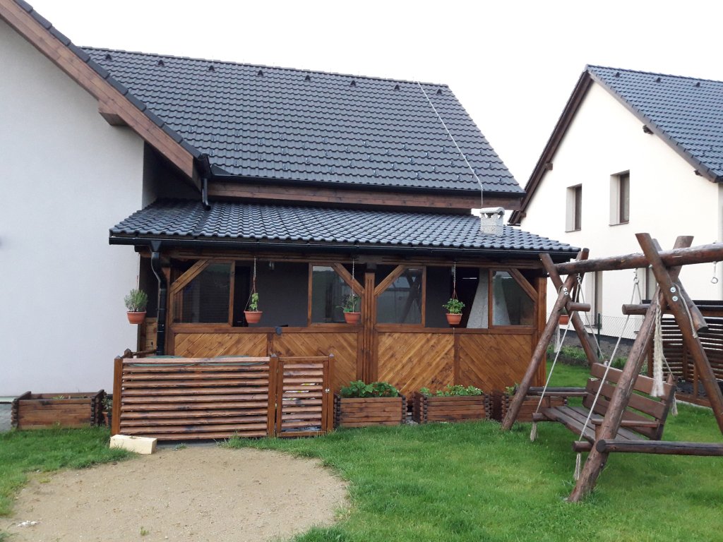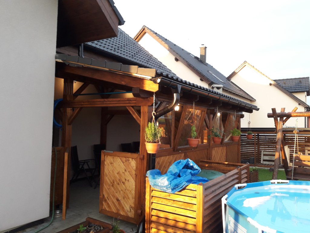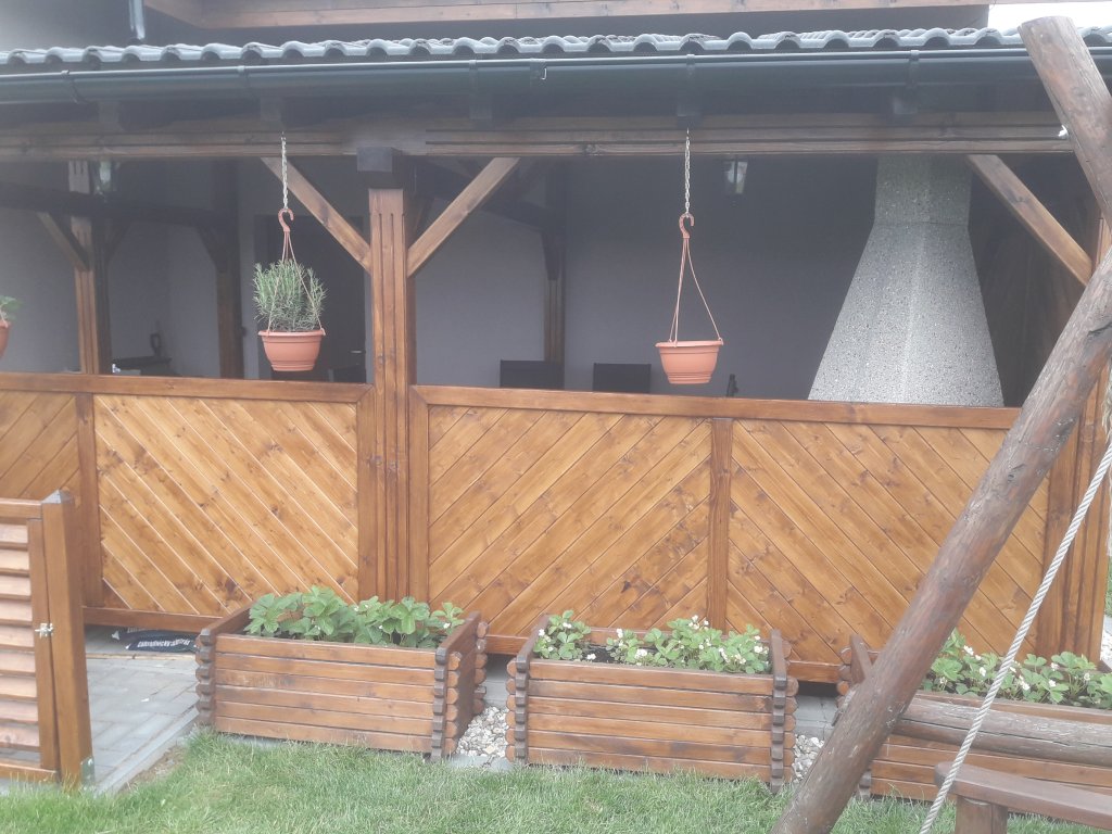 Spojení na čep a dlab, konstrukce na stavitelných patkách. Všechny hrany sraženy, obroušeno. Mezi 2. a 3. nátěrem lazurou proveden mezibrus (pro odstranění "chlupů").