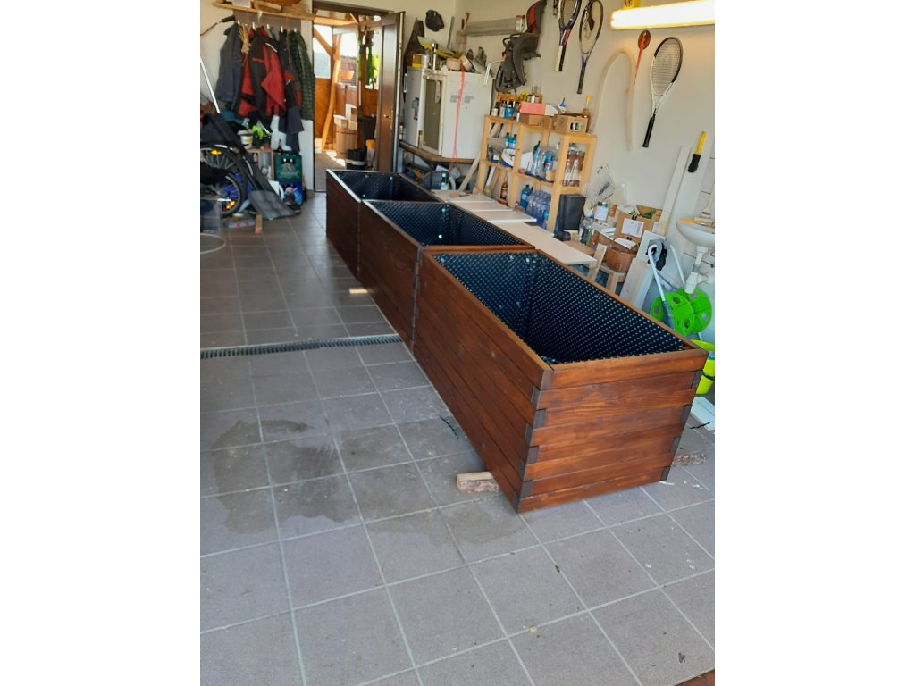 Vyvýšený záhon z hoblovaných modřínových hranolů o průřezu 80x40 mm, všechny hrany sraženy frézou 45°, vše vybroušeno. Součástí ceny je nopová folie.